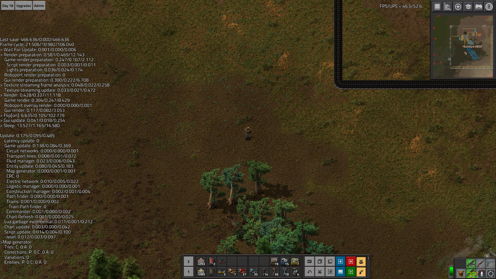 Every 20 seconds or so, the game freezes for about 5 seconds, before going back to normal. This happens in several saves I have tried. This does not happen in any other game, or on my computer in general. GPU/CPU/RAM usage never at 100%. I have attached the screenshot whilst at 60UPS/FPS, and the screenshot just after the game has stopped freezing (where the UPS/FPS is lower). This was not an issue in previous major versions (so pre 0.17) but once 0.17 hit this has been an issue. Vanilla. The problem is still apparent when in the main menu screen as well.