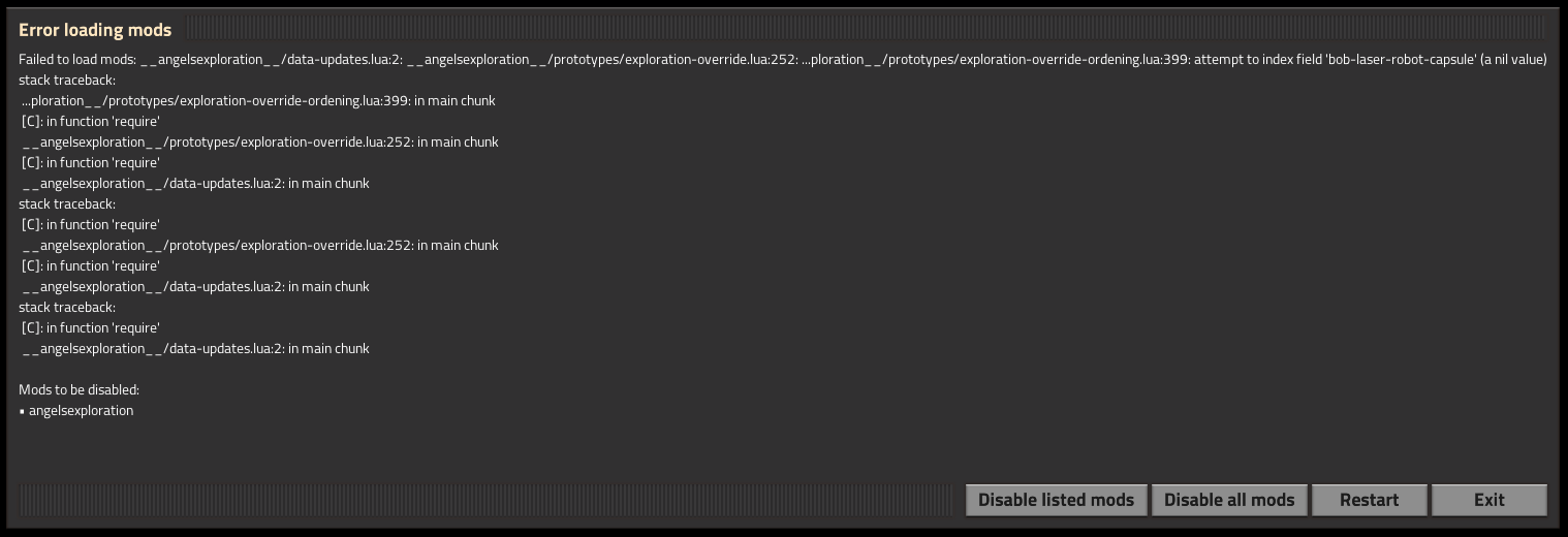 Sorry if it is an error on my end, I couldn't really find out whether Exploration was meant to be played with Bobs but since most Angels mods are I assumed so.