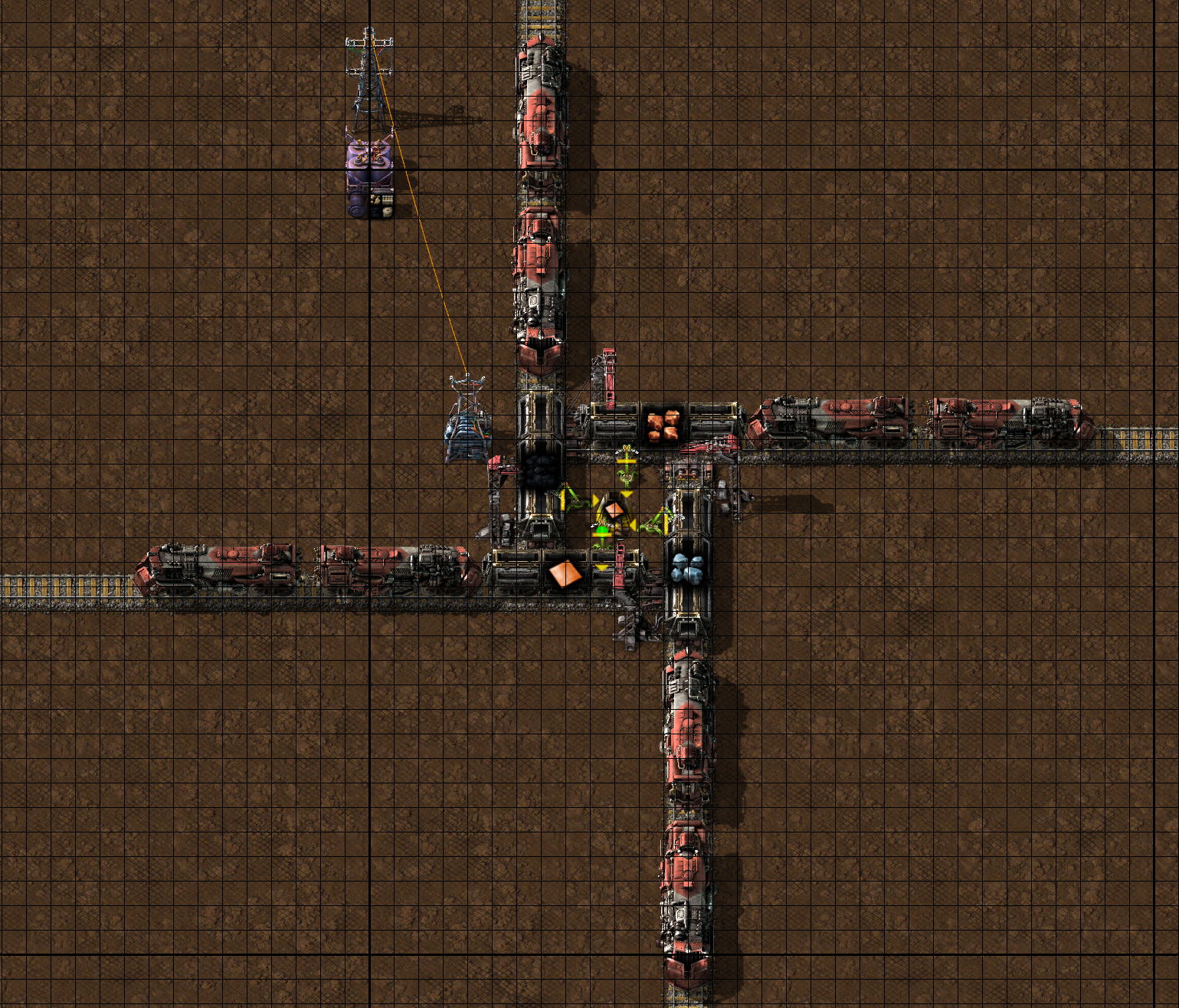 Also you can only be using two sides at a time, either vertical or horizontal; the trains on those tracks would be blocking the other two lanes. You may have missed the 'no chests' part of my challenge, I am unloading from the train direct to the factory without allowing any chests in between.