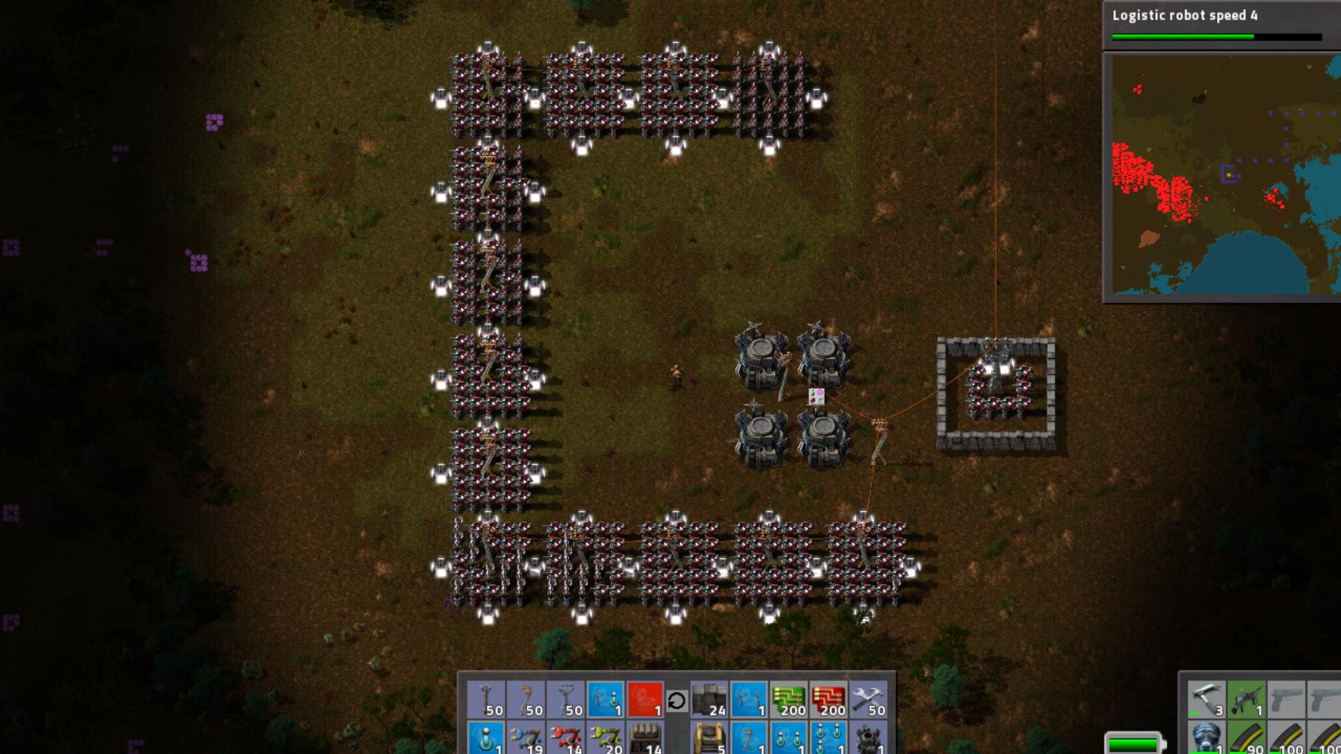 I've got 1K lasers (which is kind of overkill - 1/2 that would be sufficient, though 600+ makes the fighting a little less tedious), all the laser upgrades, 180+ speed-upgraded construction bots, 30MW of solar, 2GJ of accumulators, 30 steam engines linked in via accumulators (so they only really run when needed), and about 2.5 steel chests full of solid fuel on "standby". I still haven't quite used up all of the copper from the starting area (mined the big copper area dry, but still have a bit left in the little one). I have wiped out the eastern mega base, western one's next. I'm still only using the coal from the starting area. (10 of my steam engines are running on coal, but they hardly turn on at all, so most coal use is for plastic, and I don't have a lot of copper I can afford to throw at advanced circuits anyways - had to cut off research to save on copper - so I've got way more plastic than I can really use at the moment.)