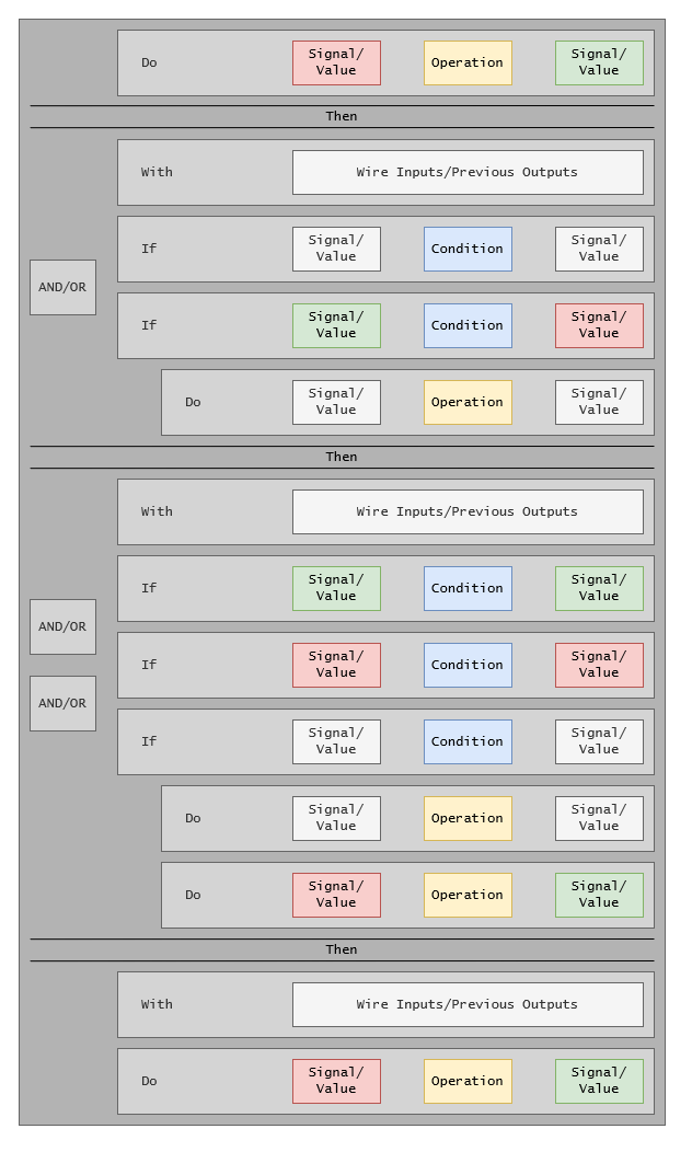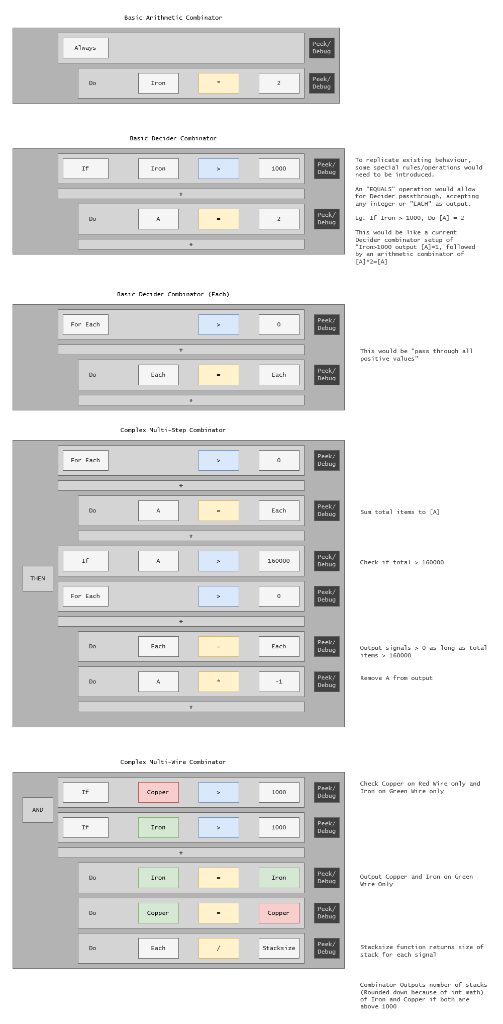 This kind of thing would use existing Factorio UI elements seen in the train stop UI, such as the AND/OR buttons, and enable multiple combinator steps to happen in one device, simplifying layouts and enabling a more configurable "building block" approach to contraptions.