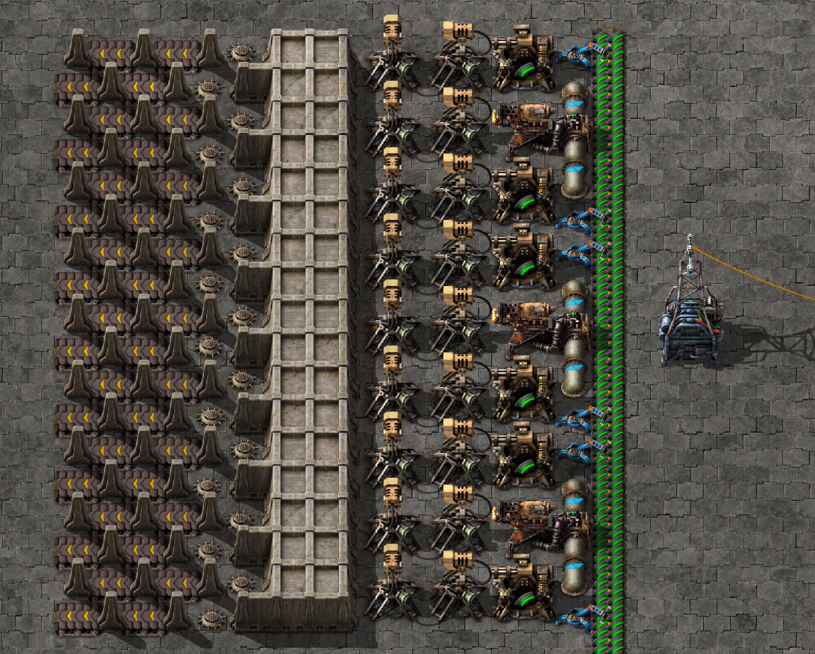 You can include that in the blueprint. If that's too much to have too restrictive of a grid, you can use logistic bots to deliver ammo and oil barrels and forego entirely with piping/belting. I agree gun turrets still don't make sense to use if you have lasers, but my point is that you can reach a point where any defense is easy to setup, not just laser. Logistic barreling flamers cold be a nice addition to your laser walls.BicycleEater wrote: Thu Jan 14, 2021 10:18 pmNot really - adding a wall with flamethrowers involves piping, and adding a wall with gun turrets involves producing ammo, and porting it in, which is not a minor task. Try building a late game wall using gun-turrets, it is really hard.4xel wrote: Thu Jan 14, 2021 6:54 pm the logistical challenge of adding a wall with any turret is exactly the same as adding a wall with laser turret