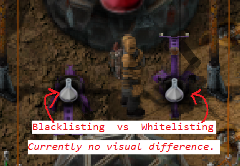 One shower thought later and it occurred to me that the block indicator (red circle) should probably be reversed between whitelist/blacklist when no item is specified.