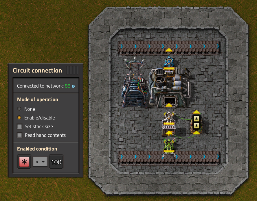 The same concept can apply to steel smelting inserter but a different logic is used here since constantly making steel is not ideal. A different logic is used. the 2 inserter grabbing iron from the chest into the smelter is a simple if iron is greater than 10 then active feeding potentially 2 furnaces at once with stack limit to 5 each. The inserter feeding the chest is set to set filter. The filter is set with the concept of using overflow. When steel is wanted a iron signal of 2147483636 is used so that when the 12 iron or above is put into the chest the filter is erased. It happens because on the 12 iron insert the number will read as a -1 iron plate erasing the filter. When you want to turn off the steel smelting you send a -1000 iron plate and it turns off.