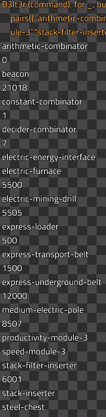 /c for _, building in pairs({"arithmetic-combinator","beacon","constant-combinator","decider-combinator","electric-energy-interface","electric-furnace","electric-mining-drill","express-loader","express-transport-belt","express-underground-belt","medium-electric-pole","productivity-module-3","speed-module-3","stack-filter-inserter","stack-inserter","steel-chest"}) do