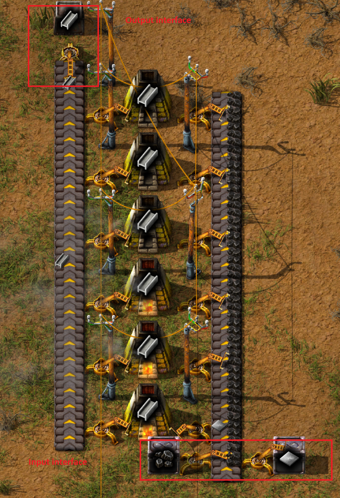 What is the basic item flow? Clearly there are 6 parallel smelteries that grab items from common belt getting items from a input chest an putting finished items to an output chest. Also, excuse my right-left direction please, wanted to keep visual connection to original smeltery screenshot.
