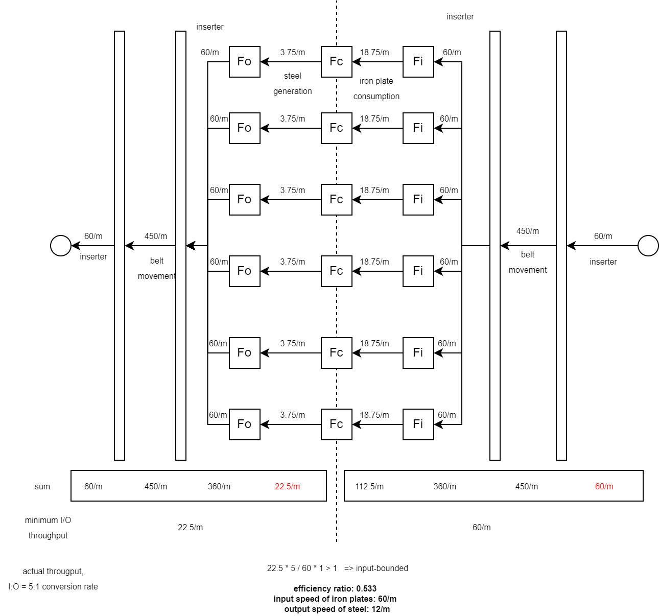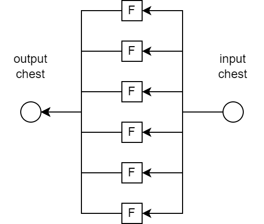 Ok, the last diagram may look little crazy, but it shows the problem. When the goal is to calculate input and output speeds, it needs to take into consideration all interfaces and their throughputs. In case of paralellism, the throughput is summed over the parallel segments. But there may be a bottleneck anywhere in the system (anyone who plays Factorio knows very well). So the goal is to find that bottleneck, because it defines the IO speed of whole system. Which in case of single-object system is its "crafting speed".