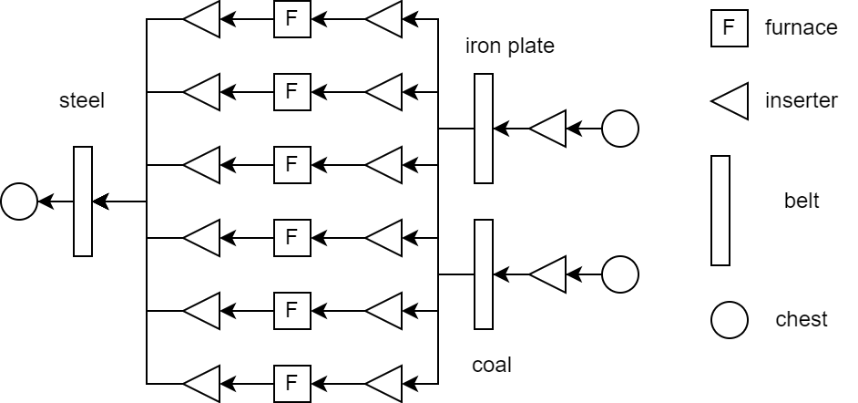 Let's extract only what happens in one furnace. Some interface speeds are simplified, namely inserter has common speed 60 items per minute.