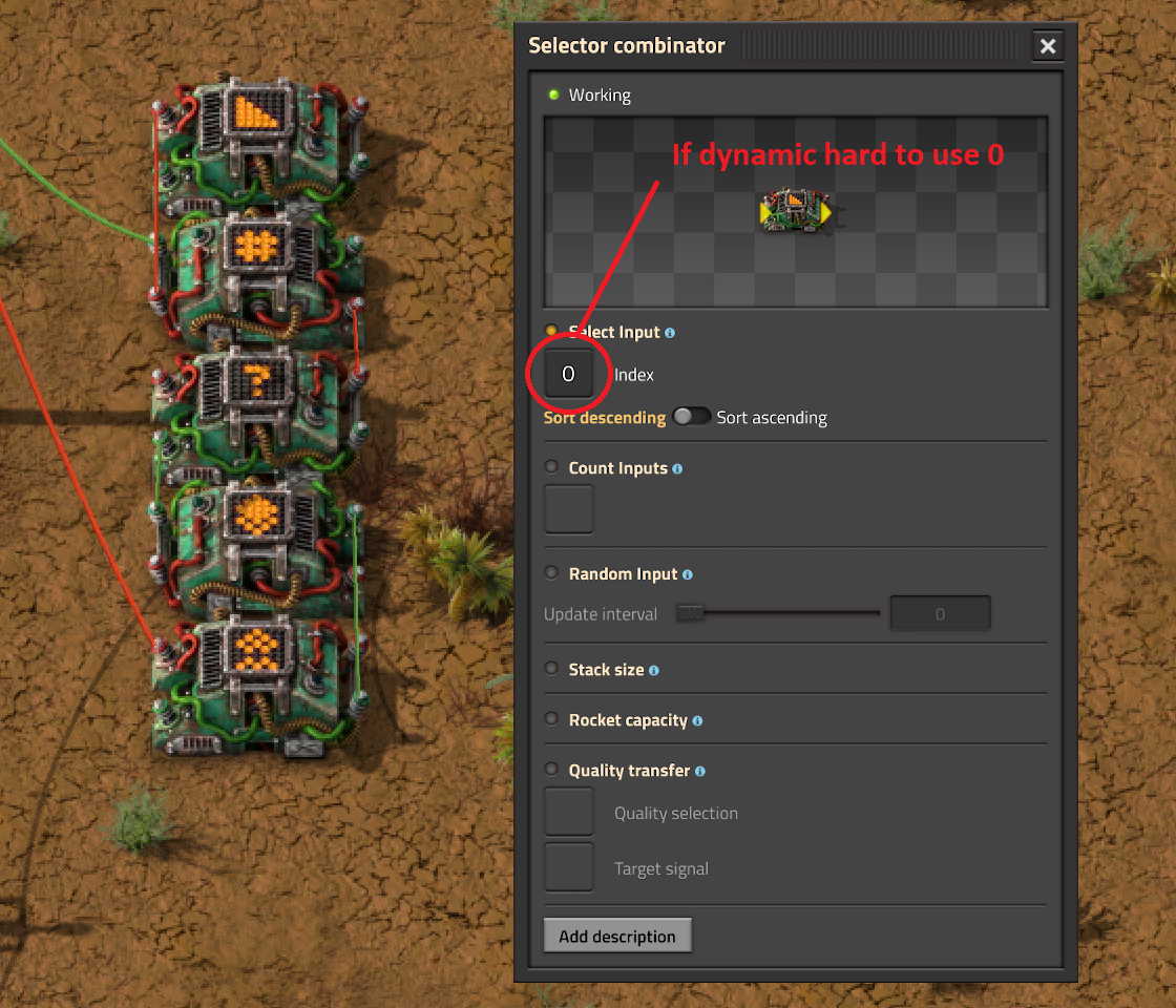 I think what IForgotMyName was going for with Enumerate is that say there are signals of A, B, C, D, E on one wire then some complex of logic assigns A = 1, B = 2, C = 3, D = 4, E = 5 to some other wire (perhaps even sorted), this would be incredibly difficult to do in any reasonable time in the current version, make a memory cell -> identify the maximum(s) and filter them out one by one while populating an enumeration buffer eventually you have a sorted list but it might have problems/conflicts if two signals have the same value, there's no easy way to separate them, you can't pick one at random, you could manually separate them out with a LOT of logic but it'd be tedious to set up and might not work very effectively.... However with the Selector it'd be easy, Sort Each => Output INDEX => Decider Each > 1 then Each = 1 => Arithmetic Each * INDEX = Each.