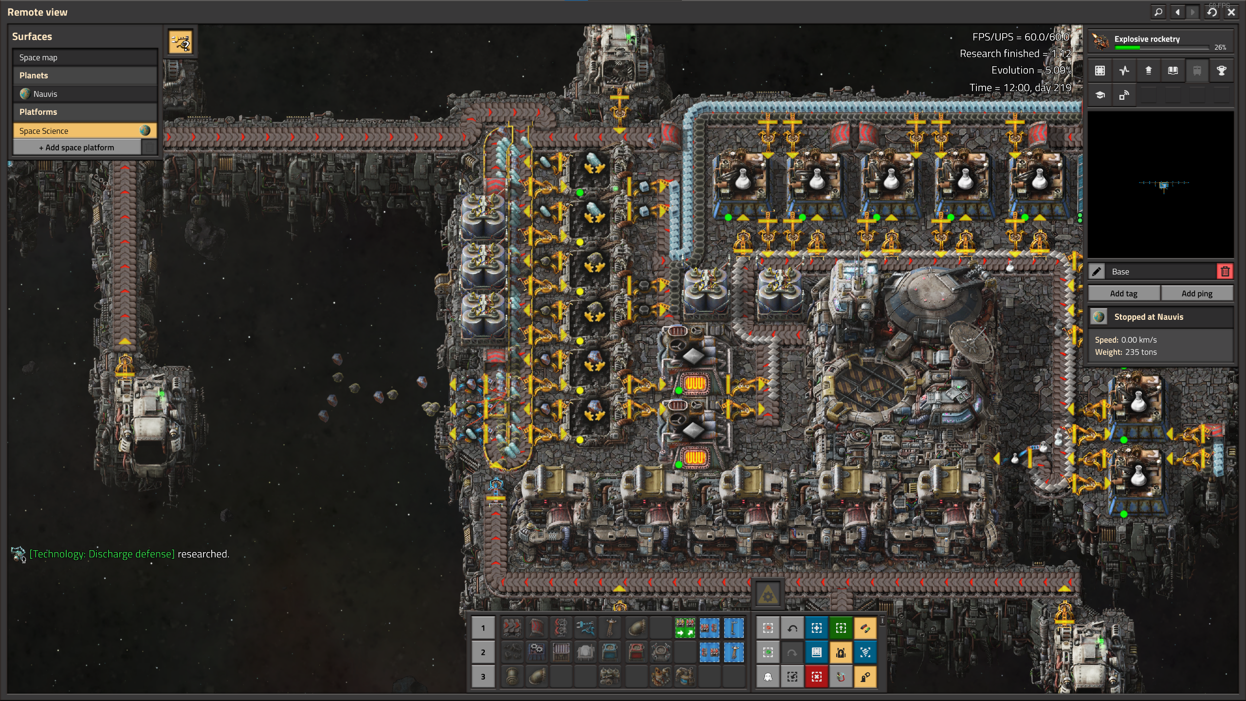 The first thing that feels quite bad about Space Age is rockets. At first I thought that rockets seemed great as they were so much cheaper than 1.1. But when I saw how little you can put in each rocket, they actually feel very expensive, especially because they're almost always wanted in large bursts. It's easy to accidentally underbuild, and then you're like, well I don't want to rebuild my whole base to add five more copper belts, especially because I want to use the new stuff from other planets in my next build, so I guess I'll just wait. The bigger issue though is the crafting time of each rocket. Considering how little they carry, the item transfer into orbit feels really very slow. I decided to upgrade my platform for a safer transit to Vulcanus and this involved about fifteen minutes of sitting around waiting for the expanded platform materials to be sent. It feels really bad to send necessary but ultimately cheap items, like belts or pipes. But it feels really very bad to send items like foundries, recyclers, etc because you fit so few of them per rocket, your platform just ends up sitting around for ages waiting to load them. Some items like uranium ammo or personal armour just feel punitive. I get that you wanted the platforms to be self-contained, but it may have been better to restrict space gun turrets to only firing "space bullets" made in space, rather than heavily nerfing transport for an item the player worked hard to get.