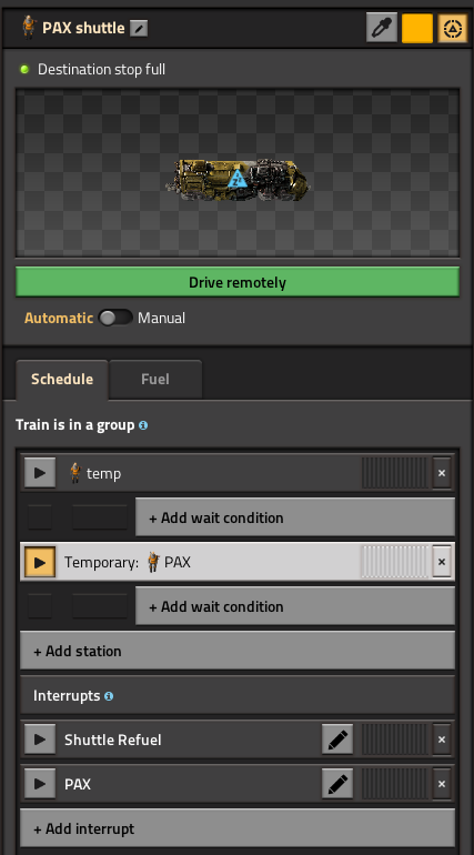 computeraddict wrote: Wed Nov 06, 2024 7:52 pm I would not expect changing the train limit of a station to have any effect on a train already en route to the station or at it. Take the example of a mine that has the simple condition of "ore > threshold, 1L". If it worked like you want it to the train would leave as soon as it had loaded enough ore to go below the threshold at the station.
