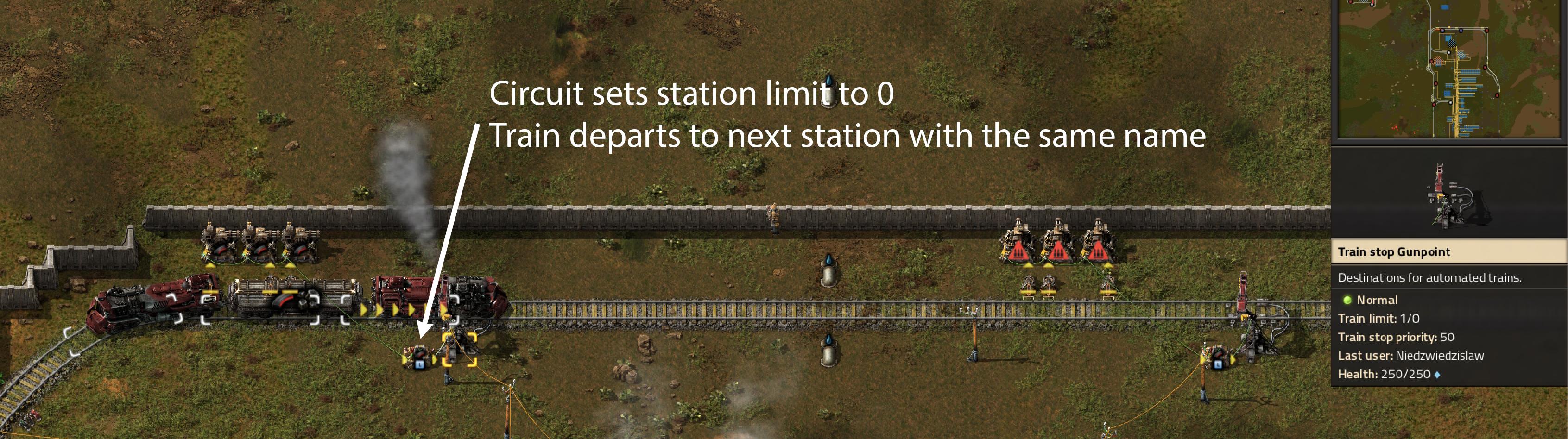 Maybe screenshot will help. I meant that if I explicitly set station limit to 0 with a circuit, the train leaves the station and goes to the next one as expected. I'm completely ignoring enable/disable because it doesn't help with anything. That's my workaround for now. Unfortunately, it requires a source of electricity, so wires go everywhere a train goes.