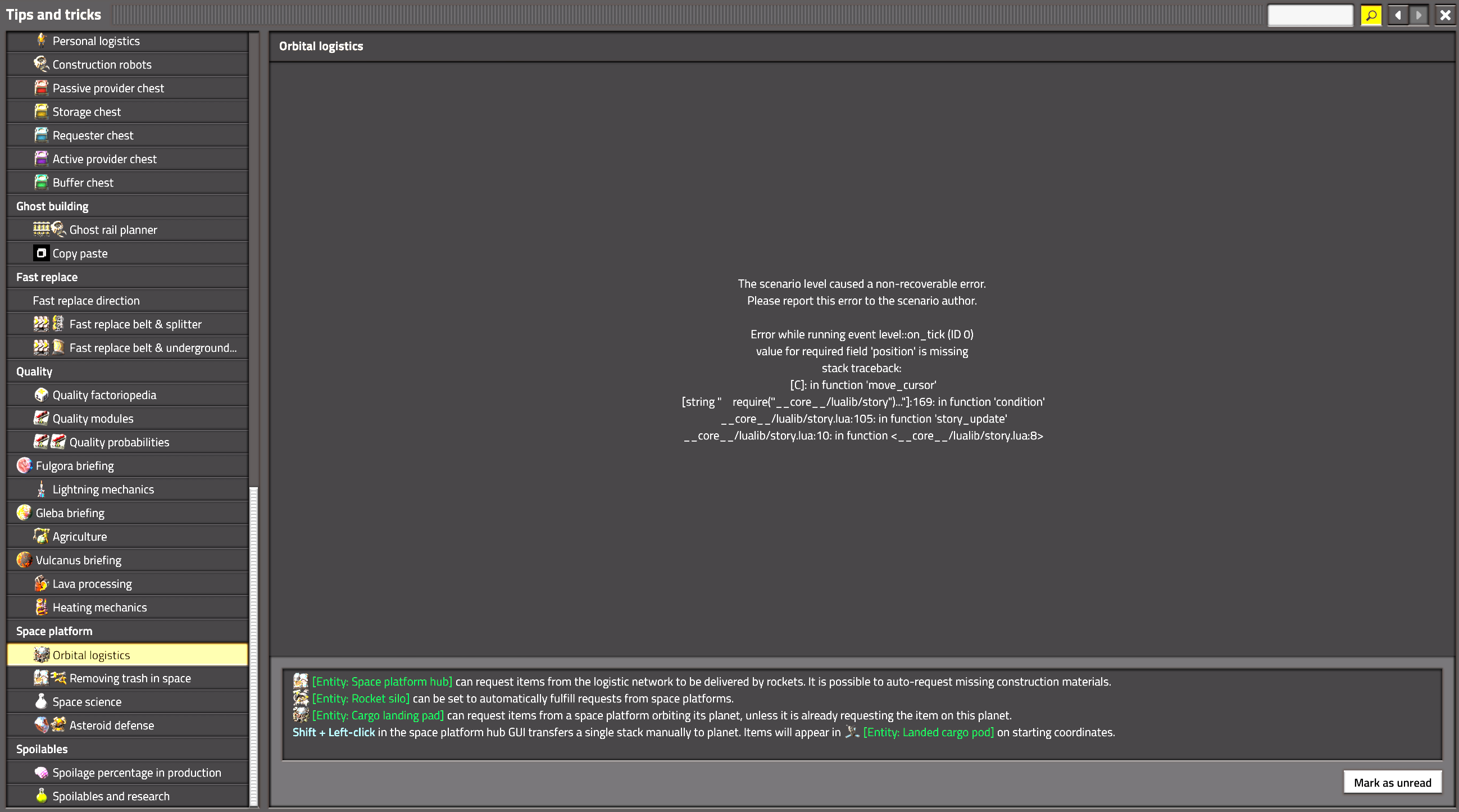 The Orbital Logistics tip scenario crashed with a non-recoverable error. This did not crash Factorio and I was also able to restart the tip and the tip crashed the same way.