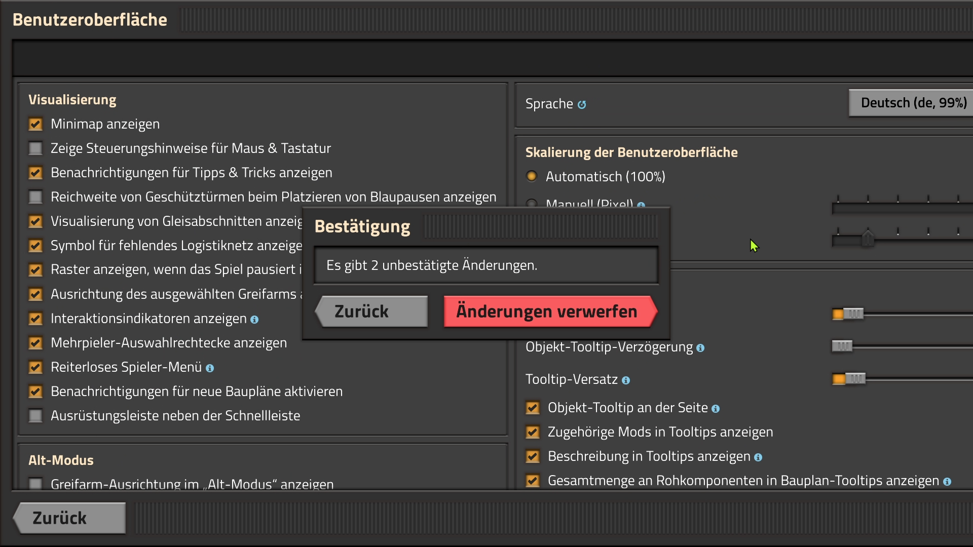 This is more of a general issue. If you select a too big UI scale, for example 200% on 1080p, the UI is too big and you cant set back to 100% UI scale anymore from inside the game and need to edit the config file manually.