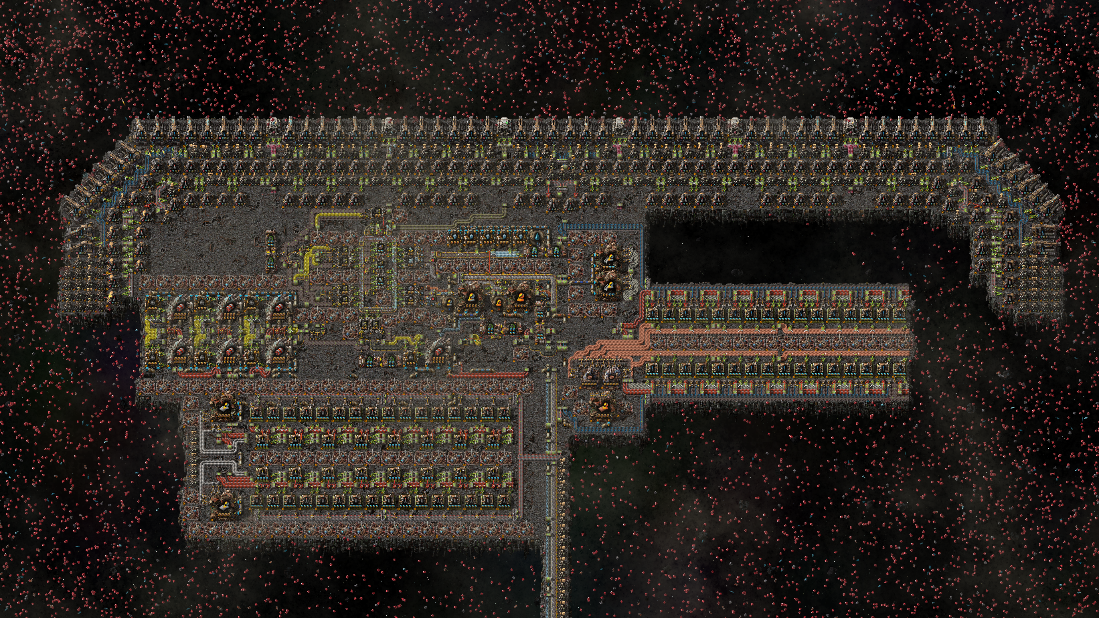 Leading the pack is an army of railgun turrets of varying qualities. Some are only shooting huge chunks, some are shooting both huge and big (it's about a 50/50 split). That's to balance out railgun consumption and rocket consumption a bit.