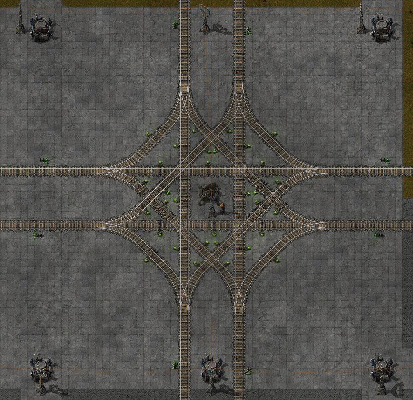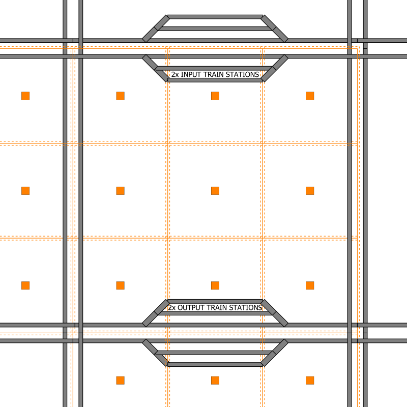 Also since the train stations now are both vertically and horizontally of equal length you can have 2 trainstations on each side of a building square... a total of 8 trainstations per building square, though it would be pretty much overkill. In-game I actually use 2 stations for delivery, and on the other side 2 stations for export, just like shown in the picture above. If you are really into some monsterbase madness I even think it would be possible to have 4 train stations at each side of the square, given if you do some additional spacing between the building sqares to accomodate all that, making a total of 16 trainstations serving one of the building squares... but that's just ridiculous.