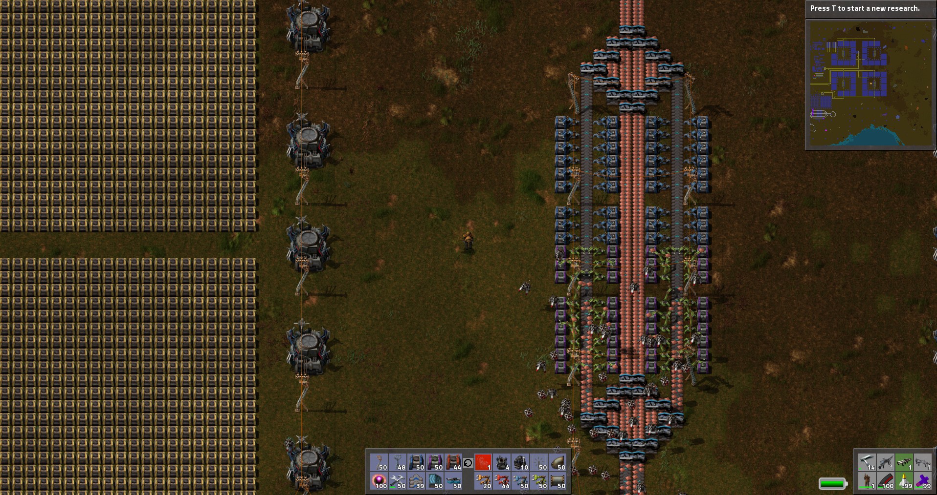 Exactly. The expenses in logistic/robots become negligible at some point. ^^DerivePi wrote:With Medusalem's approach, apart from the initial output chests and re-input chests, the storage capacity, is 1 tile for 1 chest (neglecting roboport size). The downside is the need for robots and ports, but at this point in the game, these costs are no longer a big concern. Once the proper balance of ports and robots are achieved, the full throughput of the feed belts can be stored with little more thought to arrangement.