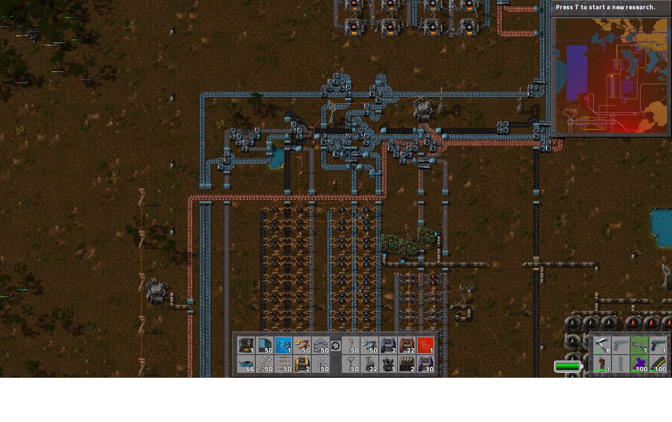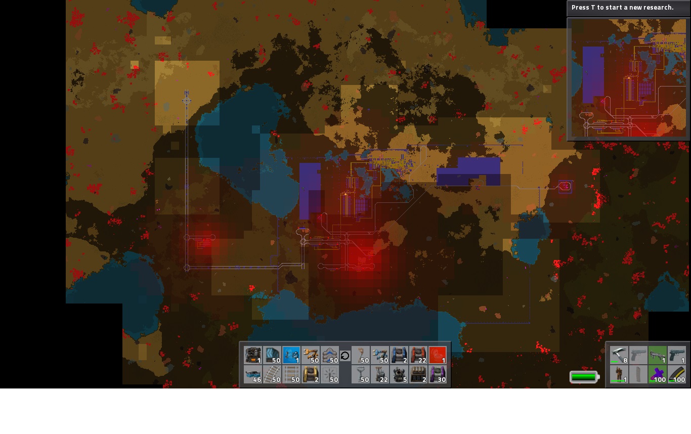 but later in the game i dont really care for all those concerns as i have massive solar/accumulator arrays and spam my mining operations with lasers when they are utside my base. speaking of base, when i really want to i could just wall off so far from my starting base that the pollution doesnt even spread to the aliens ( as i did earlier as shown in the map screenshot, however all large deposits are depleted nearby