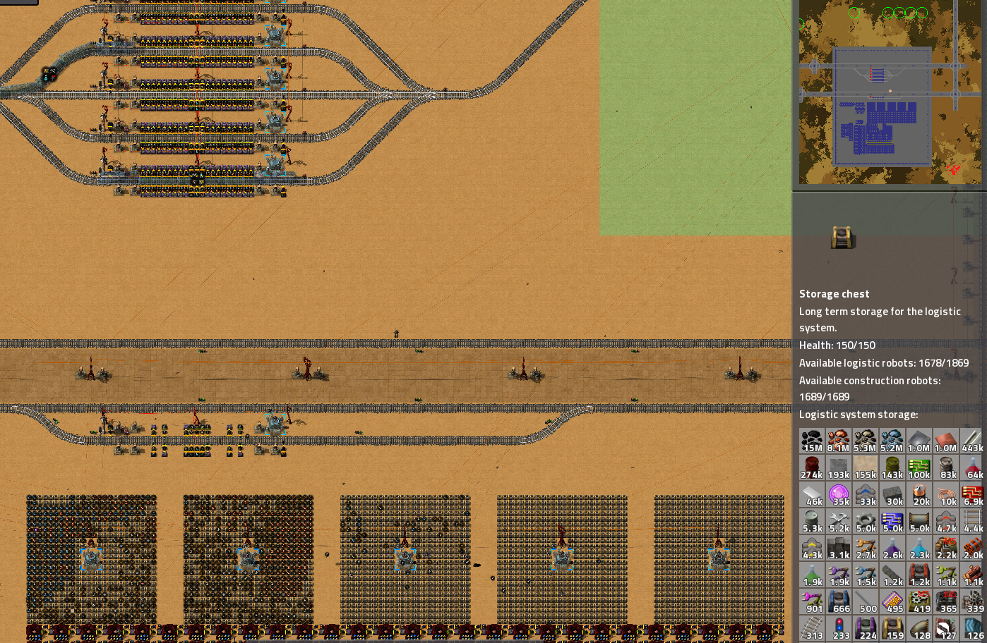 My main-train-hub consists of 5 unloading lines with inserters>active provider chests, a big storage-chest-grid (for ~750k items) and a fleet of 2000 robots. It is used to ferry in the ores from my outposts. (Iron, copper, coal, stone and oil).