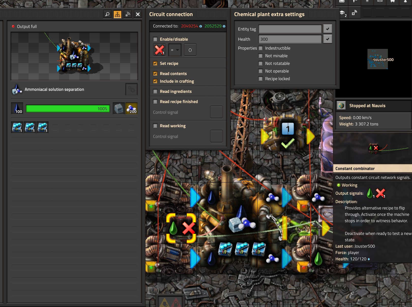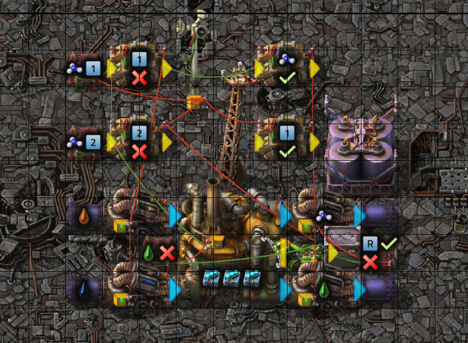 At this point, activating the reset combinator will turn on the pumps clearing the chemical plant enough to trigger a fluid void, and switch to the lubricant recipe.