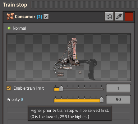In the train stop GUI, when the information icon is hovered over for the priority field, it says 255 is the maximum value. However, the slider only goes to 90.
