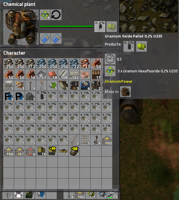 • Waste disposal and waste storage: Most "radioactive wastes" from the reactor fuel can be mitigated by fast reactor and various transmutation technologies. Wastes from enrichment as well as reprocessing is already simulated as pollution by the game. Therefore there is no waste that remains as physical item or entities or at least I will make it so in the Factorio world. One can assume that handling nuclear wastes to a space-faring society is like eating a banana to an ape.