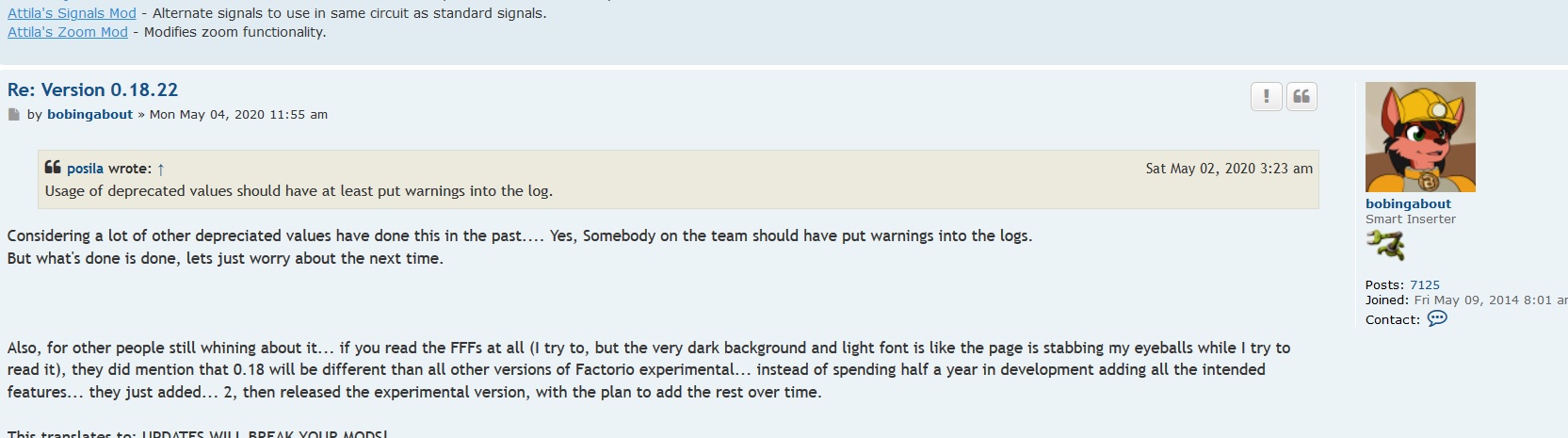Yes, I actually use Pro-silver WIDE myself (Wide version means it uses my whole screen, not just a strip down the middle 3rd), But the FFFs are on the factorio main page, they're not on the forums. and as far as I can tell, there's no option for it on www.factorio.com.5thHorseman wrote: Tue May 05, 2020 12:51 amWould you prefer this?bobingabout wrote: Mon May 04, 2020 4:55 pm the very dark background and light font is like the page is stabbing my eyeballs while I try to read it