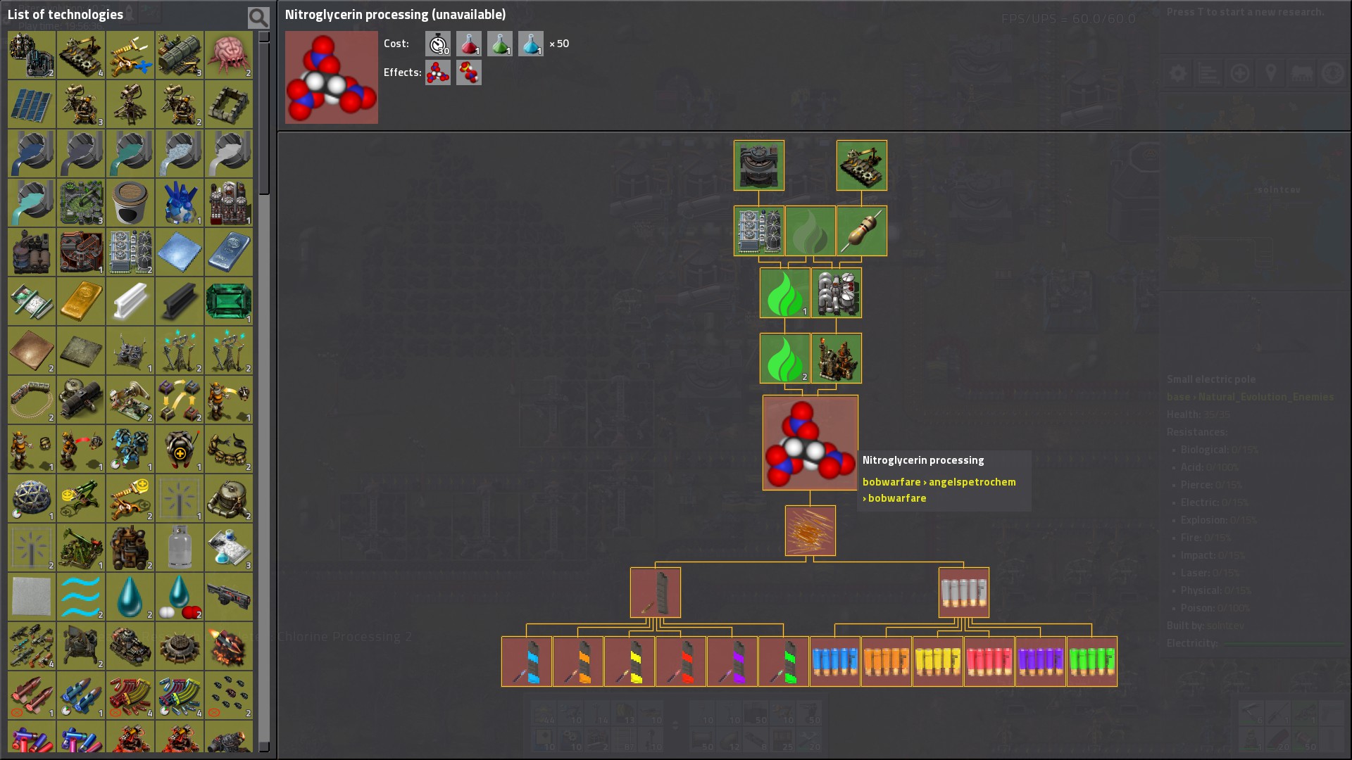 Nitroglycerin research unavailable, but previous steps are researched (in tooltip it is displayed as modified twice: bobwarfare > angelspetrochem > bobwarfare):