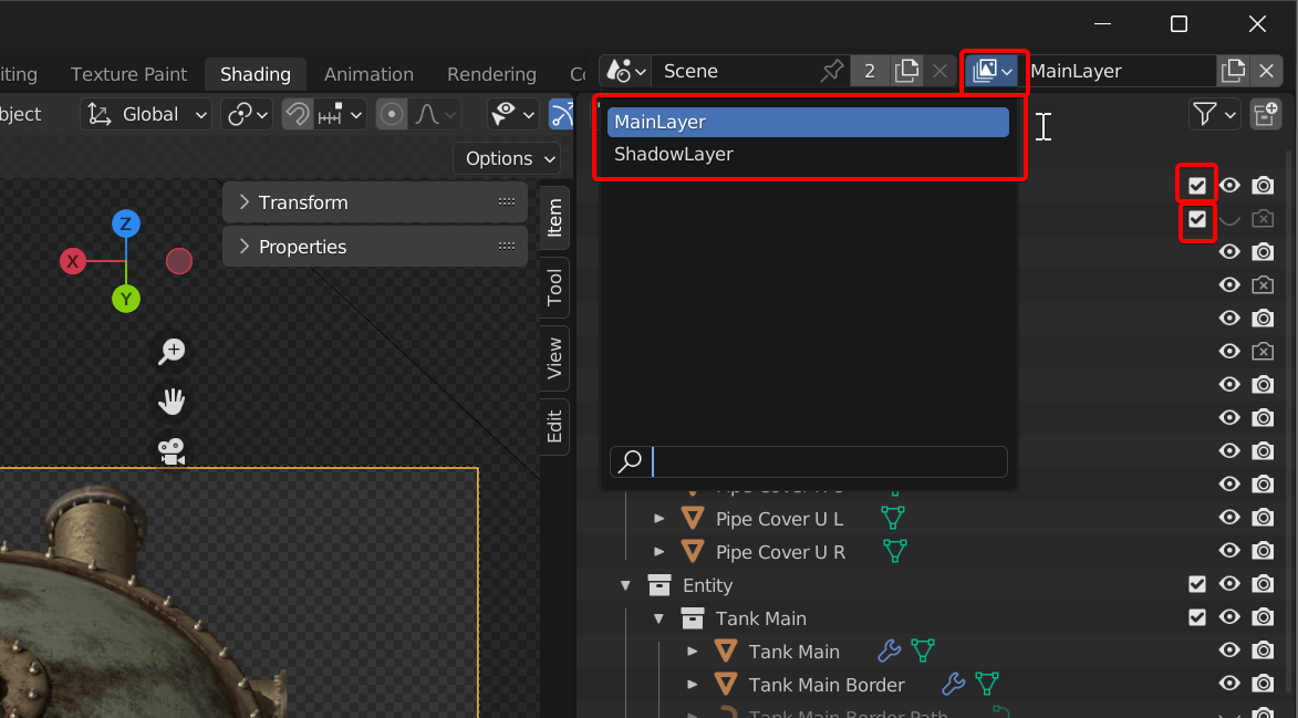 Then I made a new view layer in Blender, allowing two different ways of rendering the same scene. In each view layer, I can select which entities are included or not.