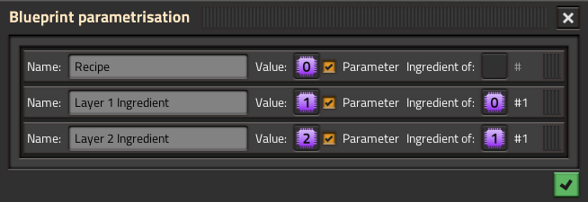 Setting up a parametrised blueprint with more than one layer of recipes set with the "Ingredient of" feature does not work how I would expect.