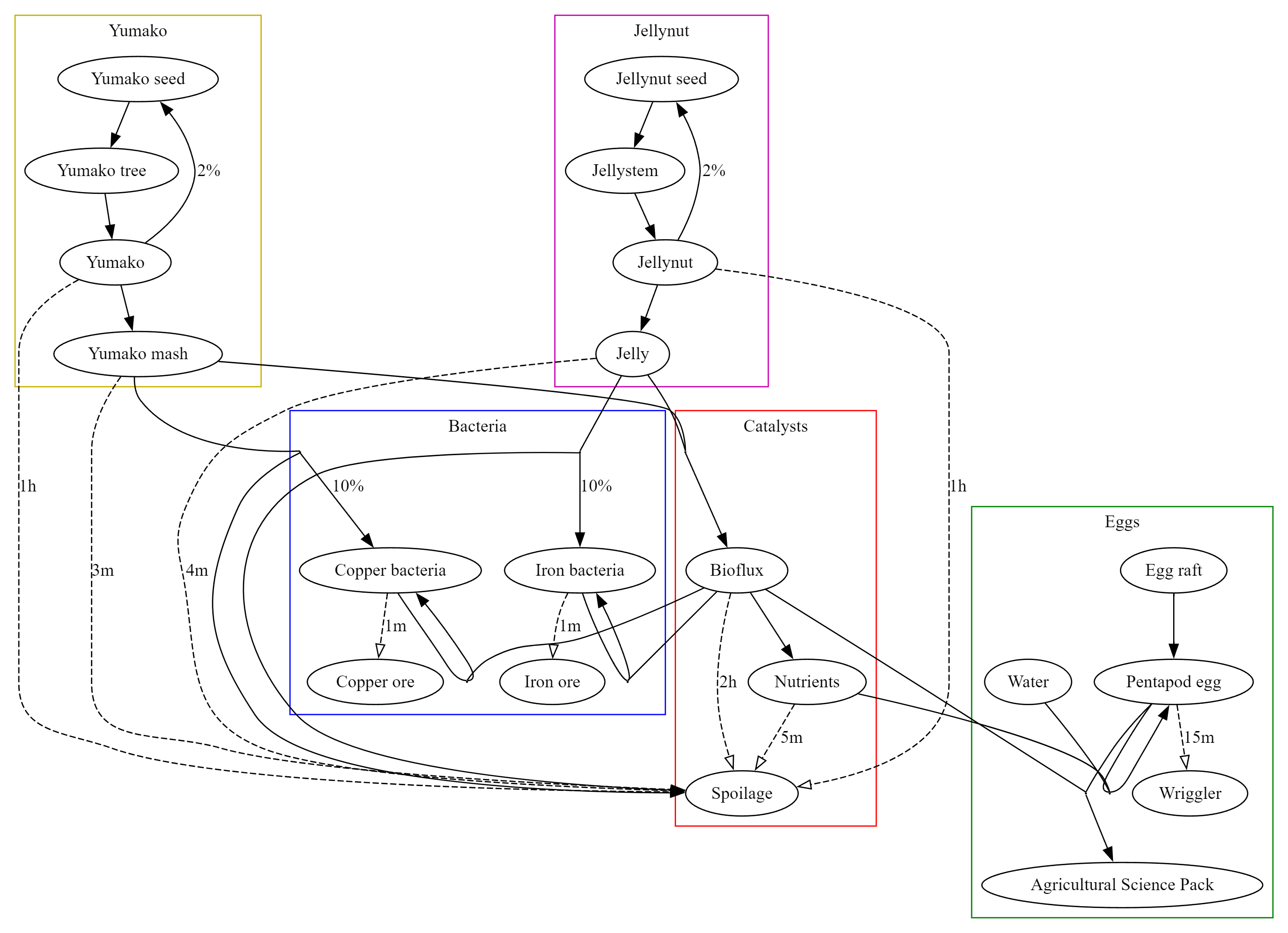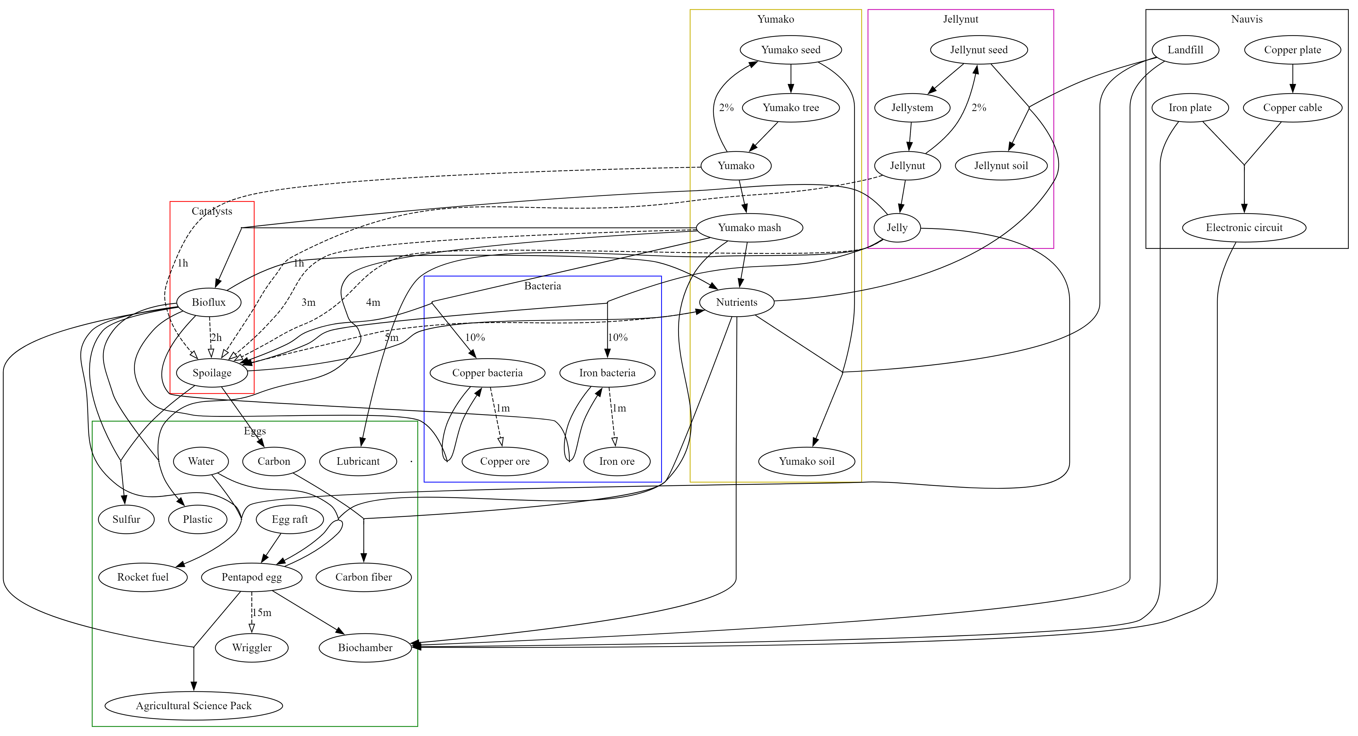 For simplicity sake, I trimmed it down to only the most Relevant recipes & ingredients (Nutrients are used EVERYWHERE); and I did not include production details - you can consult Factoriopedia or the Wiki for exact numbers. Dashed lines represent opportunities for Spoilage; make sure to plan to remove these at the end of your Belts. Here is the original "Complex" version, which I found to be a bit too unreadable: