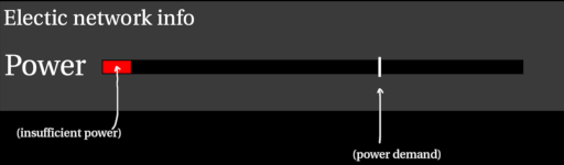 ribsngibs wrote:I agree that that is the concept behind the current UI, but imo it is not necessary from a "what information is useful to the player" point of view - if there's a mark showing demand and the power bar doesn't reach the mark and is bright red, intuitively players understand that their machines are no longer receiving all the power they need - no need to show a separate bar to show "current consumption vs 100% demand consumption", as the shortage is already easily visible from the positioning of the bar and mark. Similarly, if there is a mark showing demand and the power bar goes past it, intuitively it is easy for a player to understand that all the machines are fully powered and happy and that they have room to grow before they need to build more power generation structures - again, no need to show a separate bar showing "current power generation vs 100% potential power capacity."