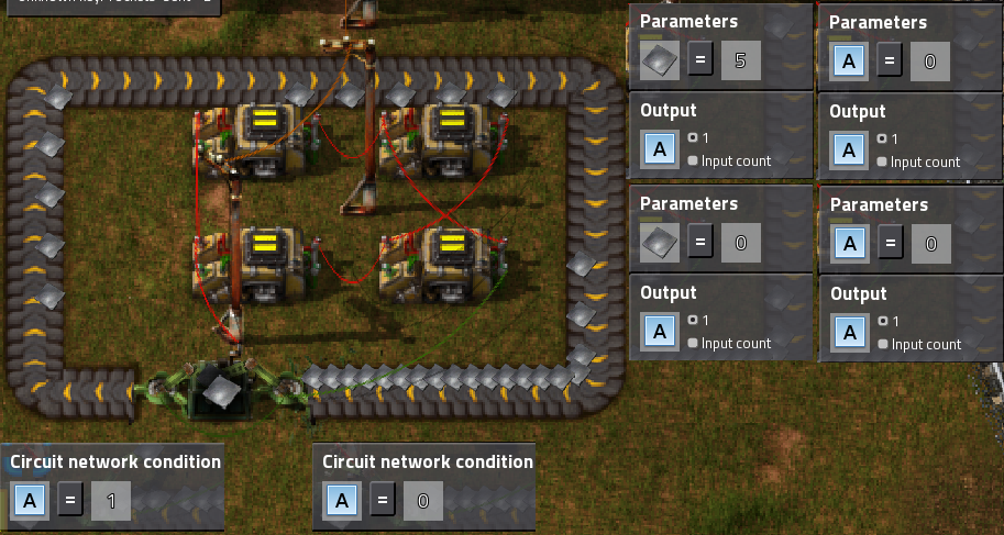 but that indeed relies on inserter capacity of 5 and checking for iron>4 in the input chest.
