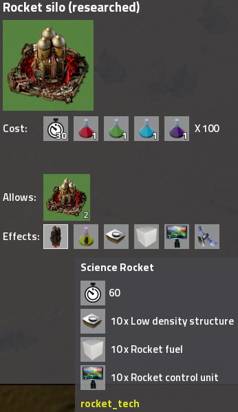 Long description: Hard end of Factorio. You are need ca. 10 rockets for building a first rocket. Nice try to make it automatically.