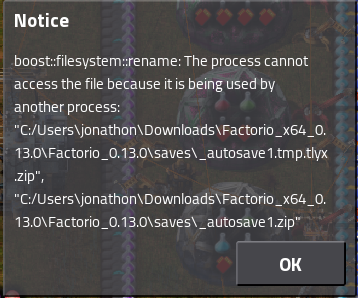 10004.283 Warning WriteFileGuard.cpp:26: Writing C:/Users\jonathon\Downloads\Factorio_x64_0.13.0\Factorio_0.13.0\saves\_autosave3.zip failed; previous version (if any) should still be available