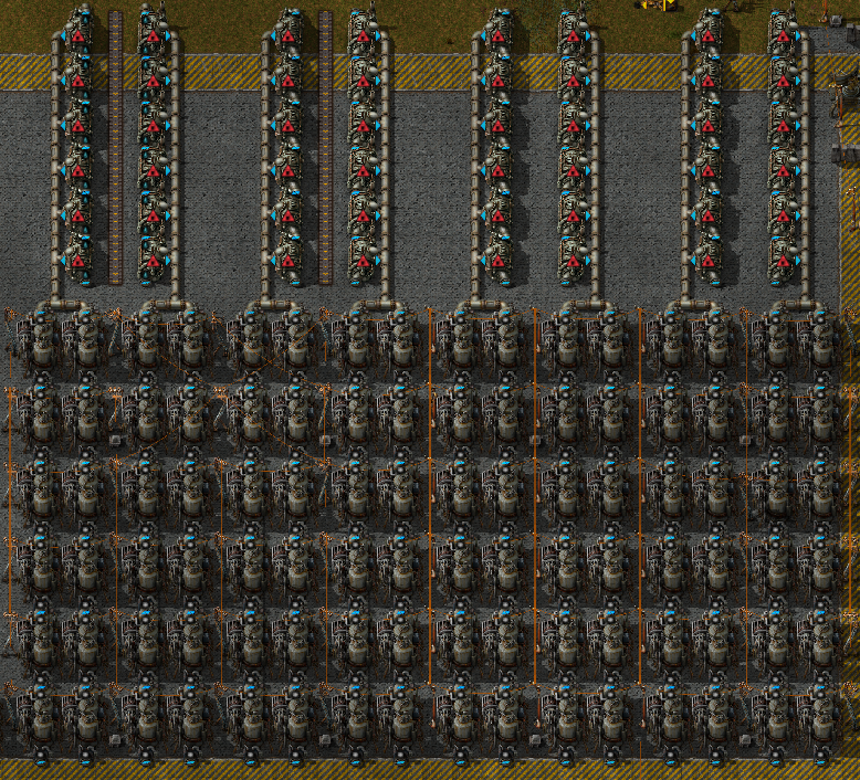 1 Pump feeding 12 (could be 20) boilers, each feeding 2 steam engines. 5 of these lines gives me 120 engiens for about 107MW of power. Was 6 lines but then I wanted the uranium ore.