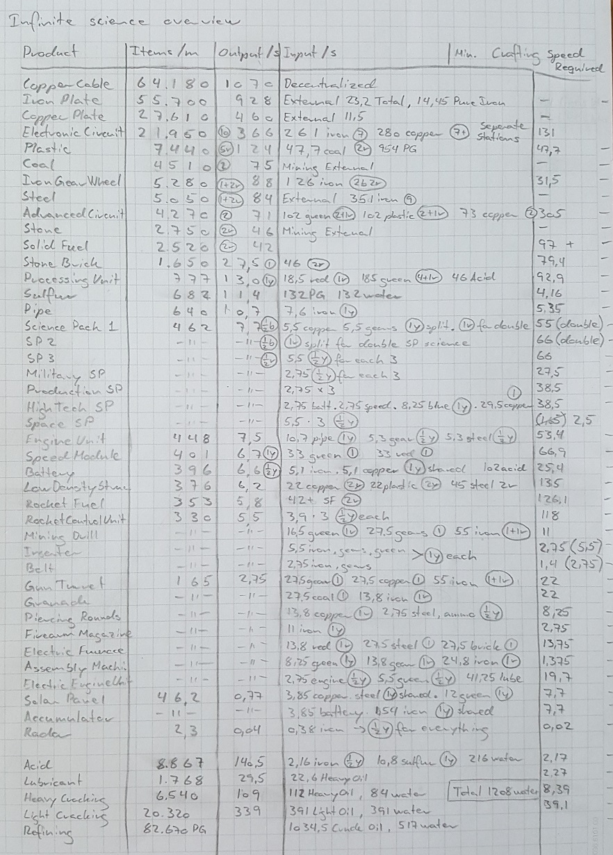 After deciding on the bottleneck of 462 science packs/min, the requirements for each recipe were calculated for the remaining products using only paper and a basic calculator (which was part of the fun for me in making this build). The results were compared to production statistics from an old factory with 462/min science packs as its limiting factor. Knowing all required resources and intermediates (assembler outputs), all inputs could be calculated and the minimum needed belts could be found. Finally, and probably most importantly, the minimum required crafting speed could be calculated. It is used to easily find the minimum amount of assembly machines to produce the required output. This is especially handy for the non-intermediate products, that can’t use productivity, and therefore don’t get dedicated beacons. They rely on being placed next to existing beacons and/or use speed modules themselves.