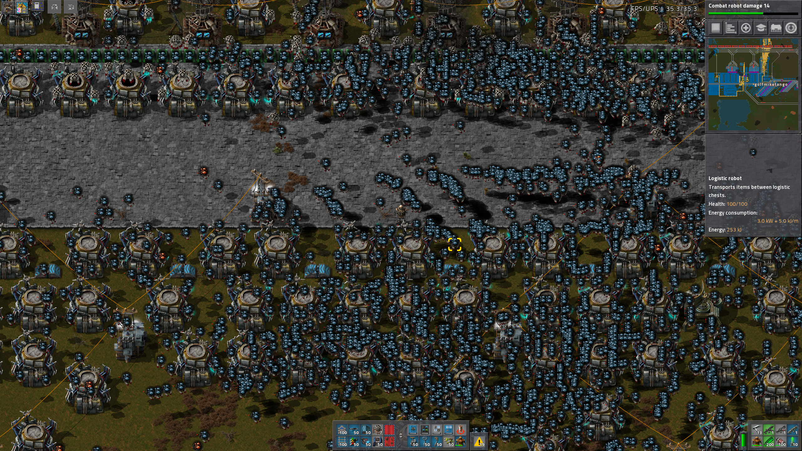 The whole way this came about was, since I usually build things like this using belts, to see what the whole kerfuffle was about, and also to experience how magically OP bots were in case the window of opportunity for that was about to close. But my conclusion is: bots are not OP and I should redesign this thing using belts because bots basically aren't able to scale throughput this high.It hasn't completely broken yet, but it's fraying at the seams, and I doubt I can place enough roboports to make it scale much higher, even though I have a respectable level of robot flying speed infinite research completed. Converting it to belts, perhaps with robotically maintained buffers, seems to me like it will fix the problem. Then again maybe I'm just not experienced enough at building for bots. I usually use them only for incidental demands. But in that case, I also seem to fail to confirm the hypothesis that bots are OP -- instead, in this case, it would seem, they are well balanced, constituting a design-skillset that must be carefully developed if you want anything amazing to happen.