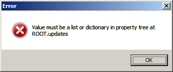 Get Error: "Value must be a list or dictionary in property tree at ROOT.updates"