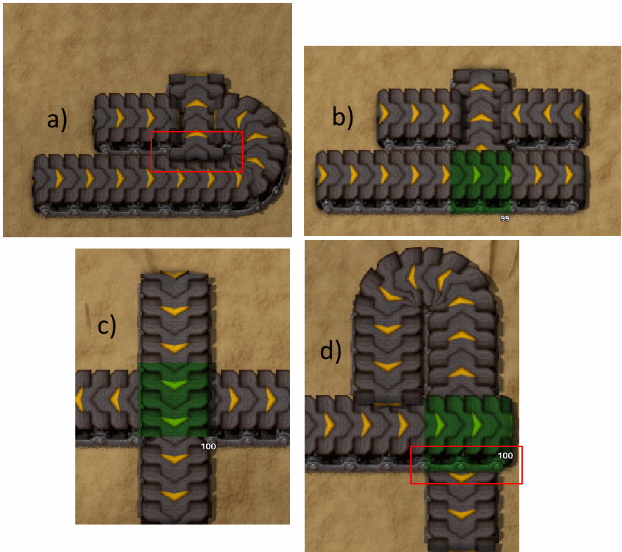 Belt moving away is also drawn on top, this is not always necessary (no items will "drop" to the other belt) and leads to Escher-like overlapping.