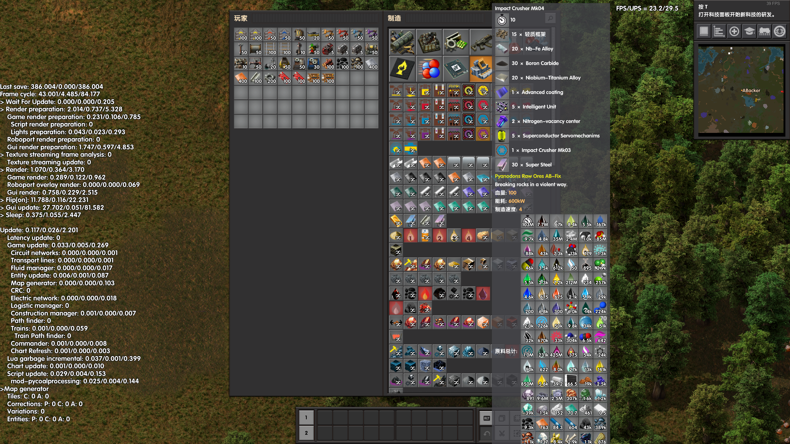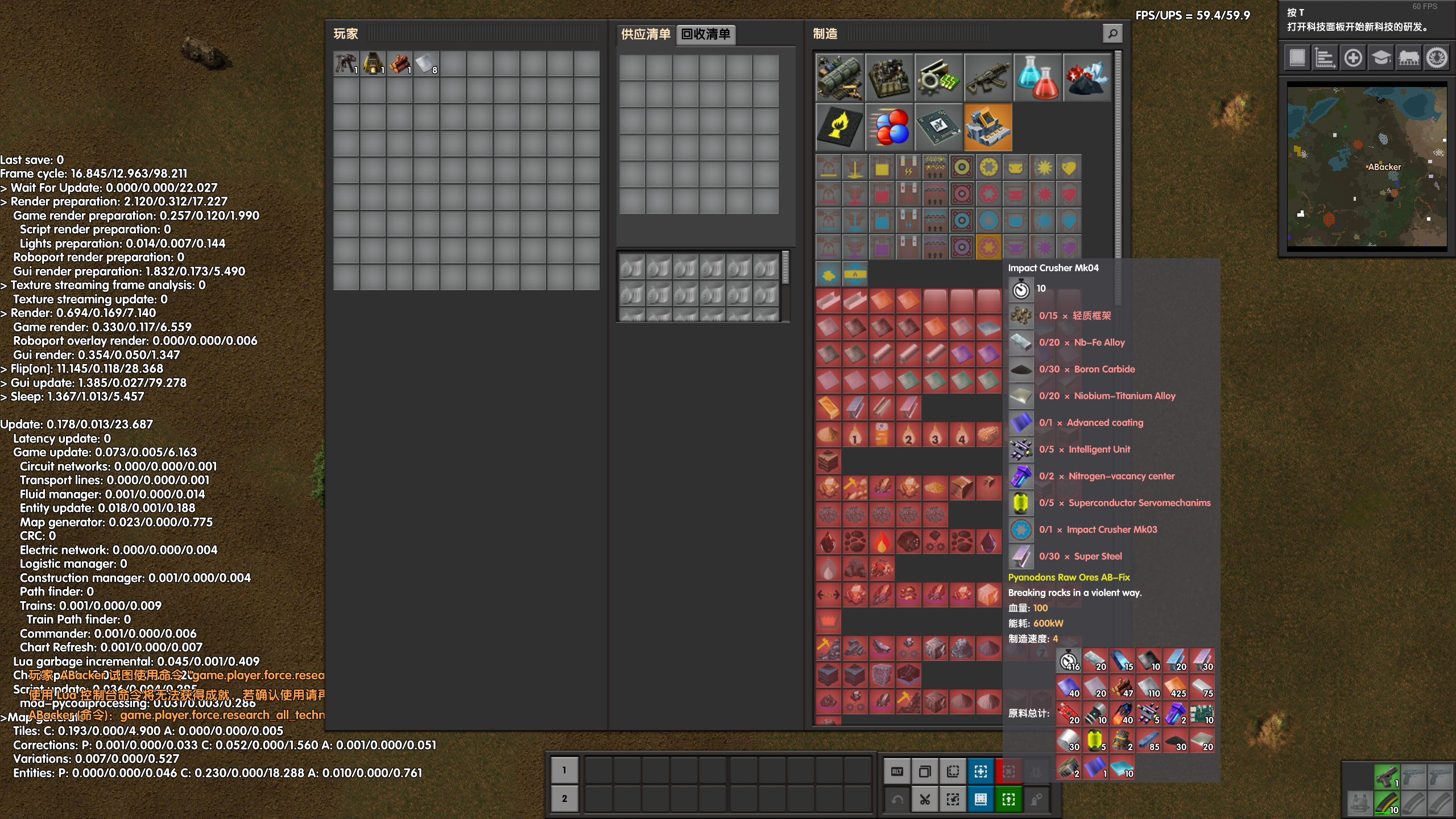 It seems to happen with cheat_mode on.And the fps drops about 2-6 even when checking the complex recipes in normal mode.