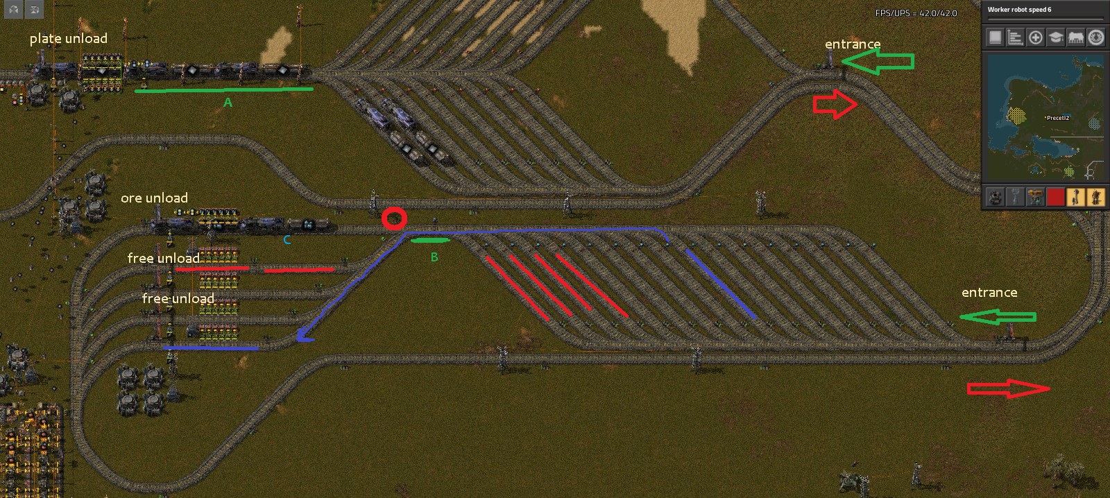 mrvn wrote: Mon Jun 17, 2019 11:22 am What you should do is merge the 4 copper/iron unload stations each into one track with a chain signal at the start. (not sure what the last 2 copper unload stations are. They don't fit a pattern). That gives you 4 tracks. Replace your red box with 4 parallel tracks with full signals and then connect them to the stacker with a chain signal. There is no need for trains to switch tracks once they picked one when they leave the waiting bay. Especially not multiple times. Since all the stations connected to one track are for the same item it can't happen that e.g. a copper train blocks iron trains stuck behind it.