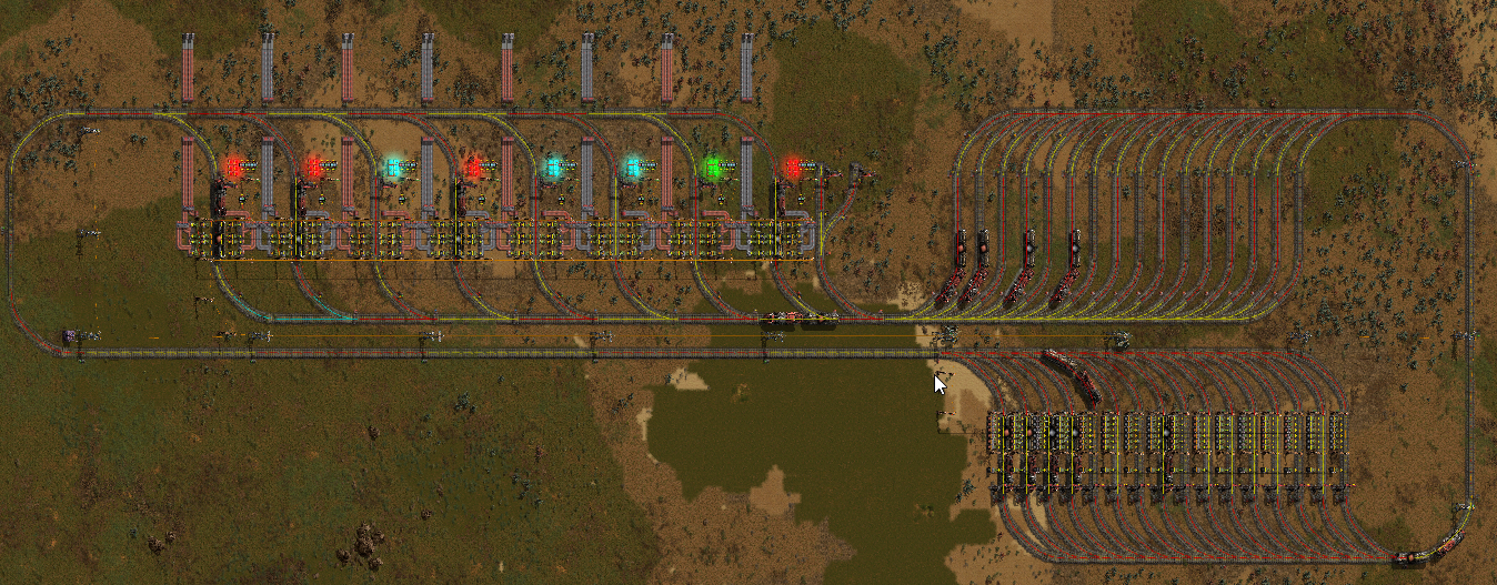 Graiver wrote: Sun Jun 16, 2019 8:58 pm I'm trying to design a waiting bay for my circuit factory so that, if I want to have 16 Iron trains running back and forth, I don't need 16 dedicated Iron stations.: