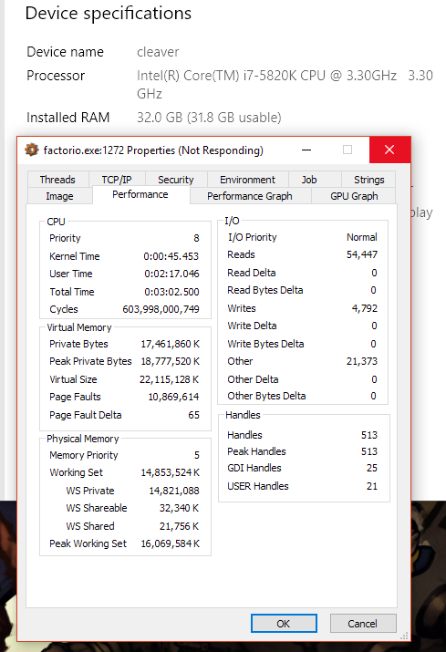 - A screenshot of Factorio's process information from Process Explorer. The fun numbers here are: