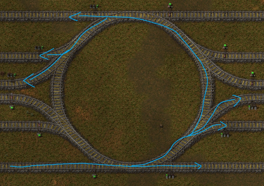 The less good side is if you want more than 1 train to use the roundabout at the same time, say from the left, one wants to go up north, the other one straight to the right of the map. They will do it one after the other which can become an issue for throughput.